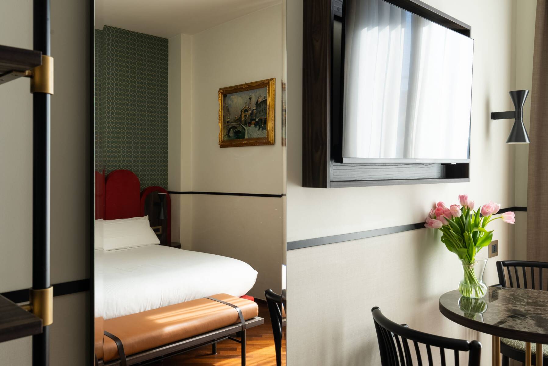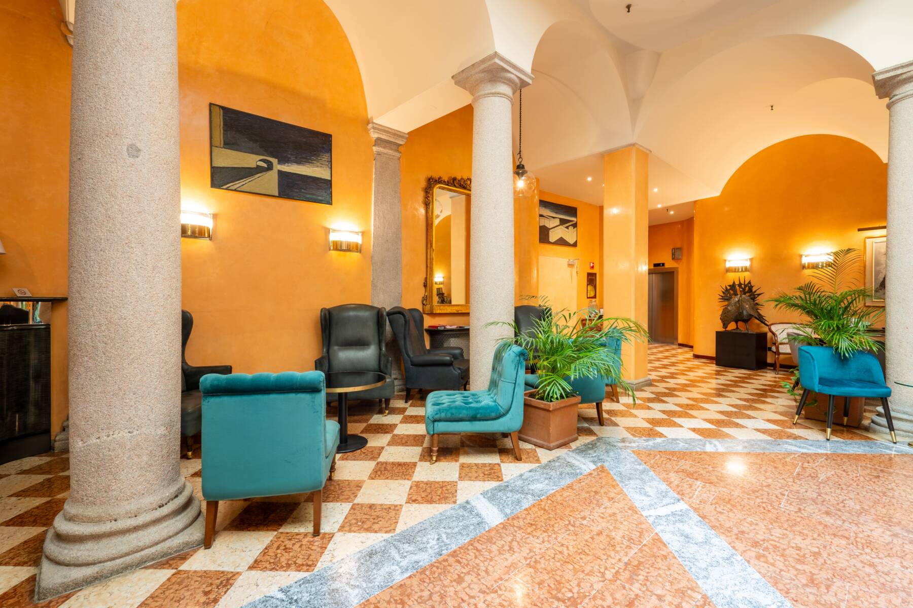 Fuori ci sono le strade acciottolate del centro, botteghe che resistono, gallerie e atelier. Il Duomo è a pochi minuti, i Navigli una passeggiata. Dentro ritrovi calma, linee pulite e materiali caldi, quell’eleganza sobria che fa stare bene. La hall disegnata da Caccia Dominioni è il nostro salotto dove a fine giornata ti prepariamo un drink e studiamo insieme la mappa del giorno dopo. Qui l’ospitalità è personale e concreta, consigli veri, ritmi umani, il piacere di farti sentire nel posto giusto.